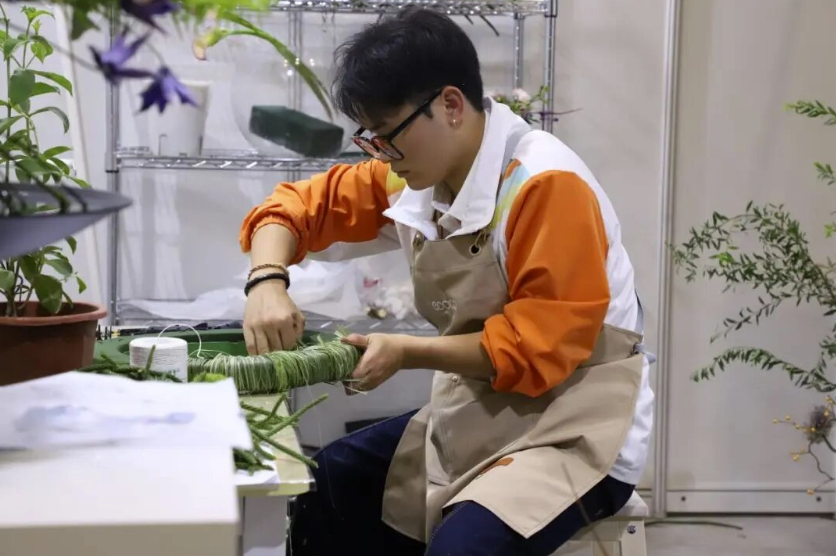 第三届全国技能大赛的备赛同样充满挑战。花艺赛项的“惊喜盒”模块要求选手在90分钟内,根据现场随机给出的材料完成创作,这对杨国进来说是个不小的难题。指导教师马凯为了帮他突破瓶颈,每周都会去花市采购不同品种的花材,从玫瑰、百合到小众的尤加利叶、小菊等,每次都故意“混搭”材料,让他在未知中快速构思。有一次,马凯带来了干枯的树枝和彩色棉线,要求他创作“自然与工业的融合”主题作品,杨国进一时没了思路,蹲在地上对着材料发呆。马凯没有直接给出答案,而是带他去校园里观察树木的形态,看阳光透过枝叶的光影。“那一刻我突然明白,花艺不是简单的拼接,而是要懂自然、懂情感。”最终,杨国进在国赛“惊喜盒”模块中,作品因“设计巧思与实操精度兼备”,获得了评委的高度认可。